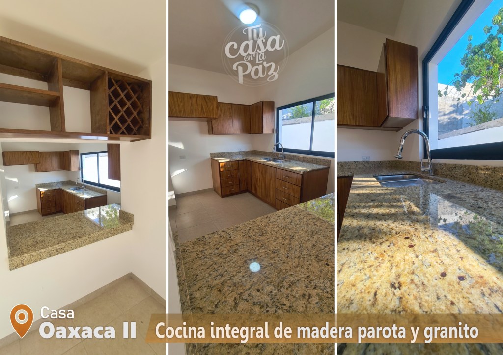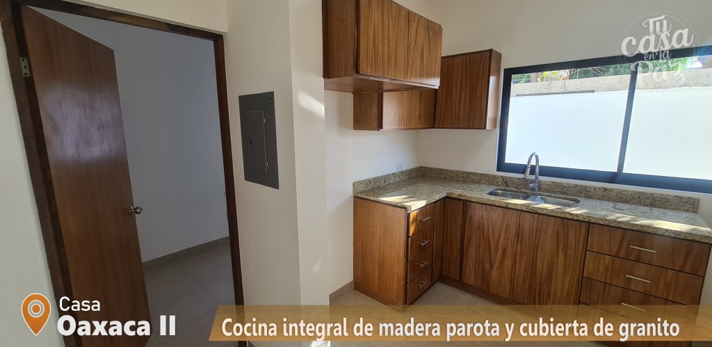 Vanities de baños, clóset y cocina integral hechos de parota y detalles con cubierta de mármol.